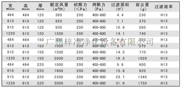 有隔板高效過濾器規(guī)格尺寸參數(shù):