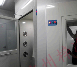 采取自動(dòng)感應(yīng)方式啟動(dòng)風(fēng)淋,定時(shí)器計(jì)時(shí)結(jié)束吹淋,(雙門(mén)采用電動(dòng)聯(lián)鎖);在內(nèi)部置緊急停止按鈕,按下急停按鈕,雙門(mén)均可打開(kāi);停電時(shí)雙門(mén)均可打開(kāi)。