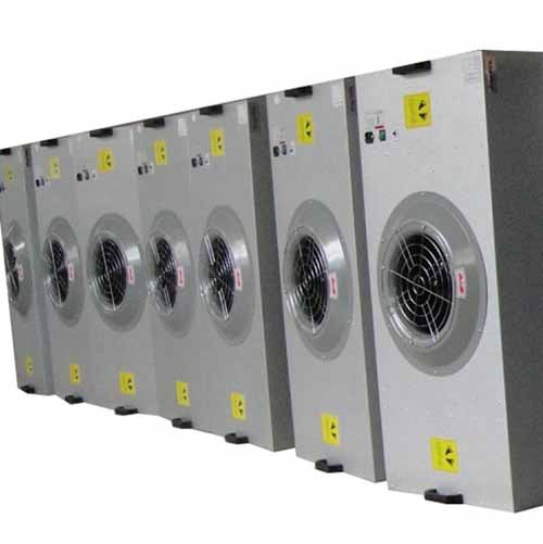 風(fēng)機(jī)從FFU頂部將空氣吸入,經(jīng)初效過(guò)濾器,高效過(guò)濾器過(guò)濾,過(guò)濾后的潔凈空氣在整個(gè)出風(fēng)面以0.45m/s±20%的風(fēng)速勻速送出到萬(wàn)級(jí)潔凈棚內(nèi)。形成均流層,使?jié)崈艨諝鈿饬鞒蚀怪眴蜗蛄鳎瑥亩WC了工作區(qū)內(nèi)所要求的潔凈度。