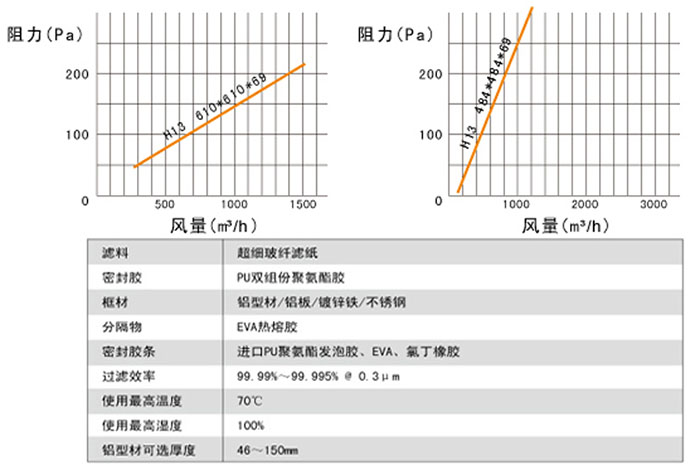無隔板高效空氣過濾器阻力與風量關系圖: