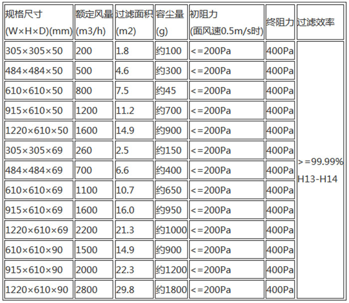 過濾效率:99.97%-99.999%(H13、H14) MPPS